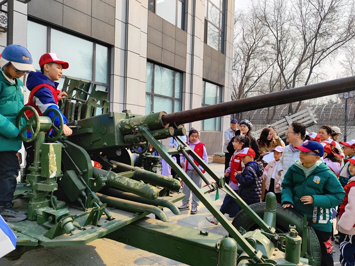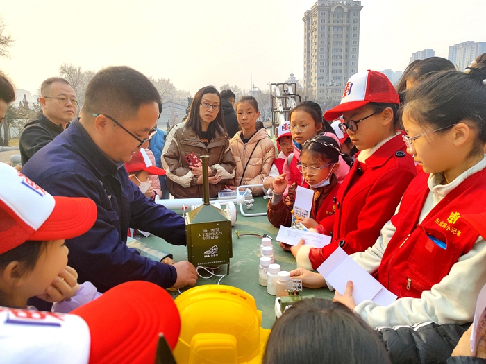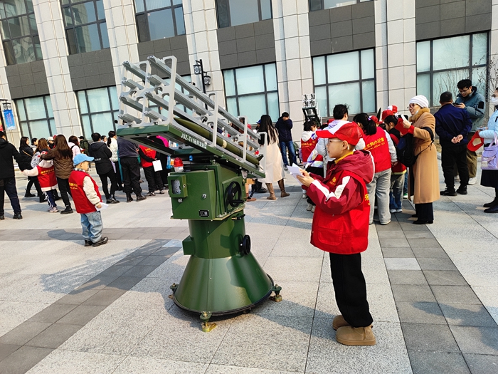 隨後,一組人工影響天氣作業裝備引發了小記者們的濃厚興趣。工作人員詳細講解了高炮如何防冰雹、火箭發射架如何通過播撒催化劑增加降水。在模型展位前,孩子們還近距離觀察了火箭彈模型、地面碘化銀燃燒爐模型、測紫外線設備等,對人工影響天氣的技術手段有了更直觀的認識。