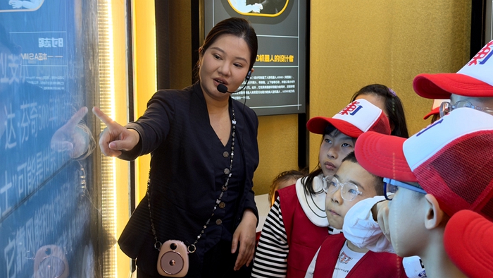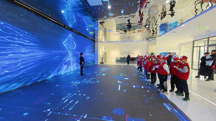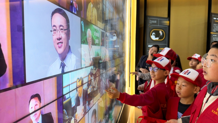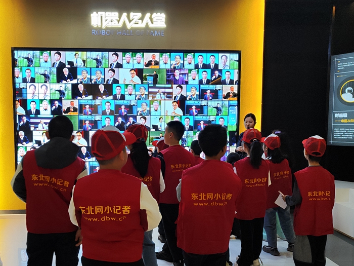 在莊重的機器人名人堂,一面巨大的屏幕佔據了整面牆壁,上面是一幅匯聚了古今中外對機器人發展作出卓越貢獻的名人照片牆。小記者們放輕腳步,目光被這張跨越時空的『群星圖譜』深深吸引。他們仰頭尋找著熟悉的面孔,有人伸出手指,輕輕點了一下中國機器人事業開拓者蔣新松院士的照片——屏幕瞬間切換,蔣新松院士的簡介和他帶領團隊研制出我國第一臺工業機器人、為中國機器人事業奠基的卓越成果清晰呈現。孩子們圍上前去,認真閱讀著這位科學家的生平事跡,透過指尖與先輩『對話』。