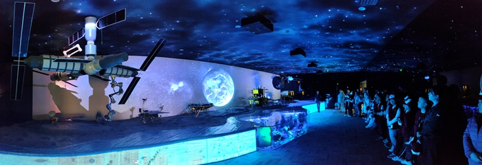 步入航天廳,燈光漸暗,巨型環幕亮起。隨著倒計時歸零,一枚『火箭』拔地而起,轟鳴聲震徹展廳——視頻短片將中國航天與水下機器人的輝煌成就濃縮於方寸之間。小記者們屏息凝神,見證『嫦娥』攬月、『天問』探火、『奮斗者』號萬米深潛的震撼瞬間。